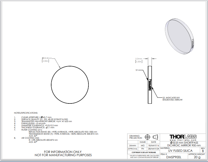 Thorlabs索雷博       DMSP900L   短波通二向色镜