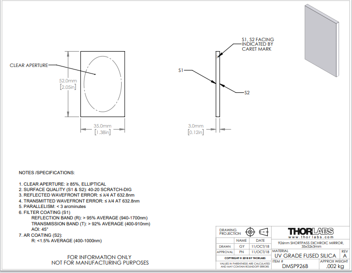 Thorlabs索雷博 DMSP926B 短波通二向色镜