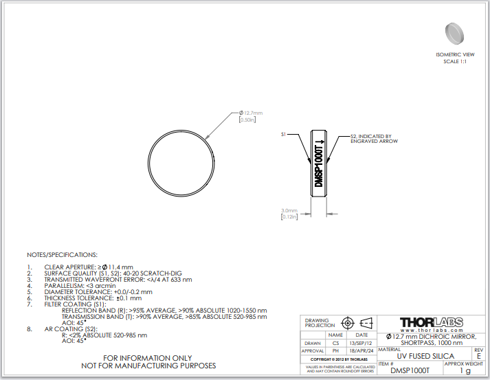 Thorlabs索雷博       DMSP1000T   短波通二向色镜