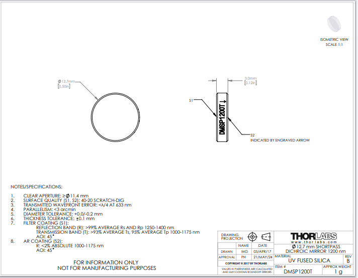 Thorlabs索雷博       DMSP1200T   短波通二向色镜