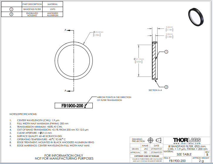 Thorlabs索雷博 FB1900-200 Ø25 mm红外带通滤光片