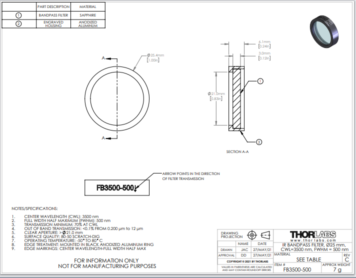 Thorlabs索雷博       FB3500-500   Ø1英寸红外带通滤光片