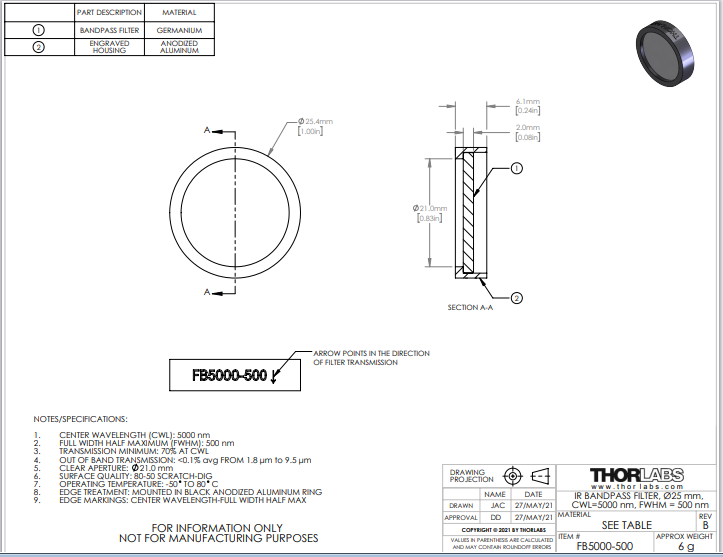 Thorlabs索雷博       FB5000-500   Ø1英寸红外带通滤光片