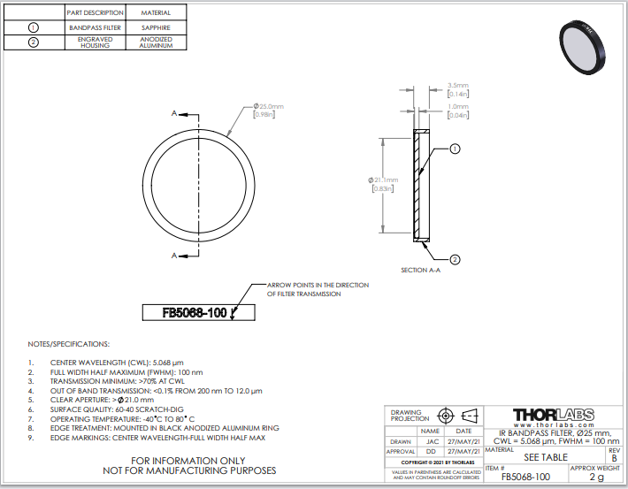 Thorlabs索雷博       FB5068-100   Ø25 mm红外带通滤光片