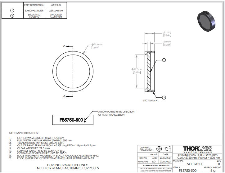 Thorlabs索雷博       FB5750-500   Ø1英寸红外带通滤光片