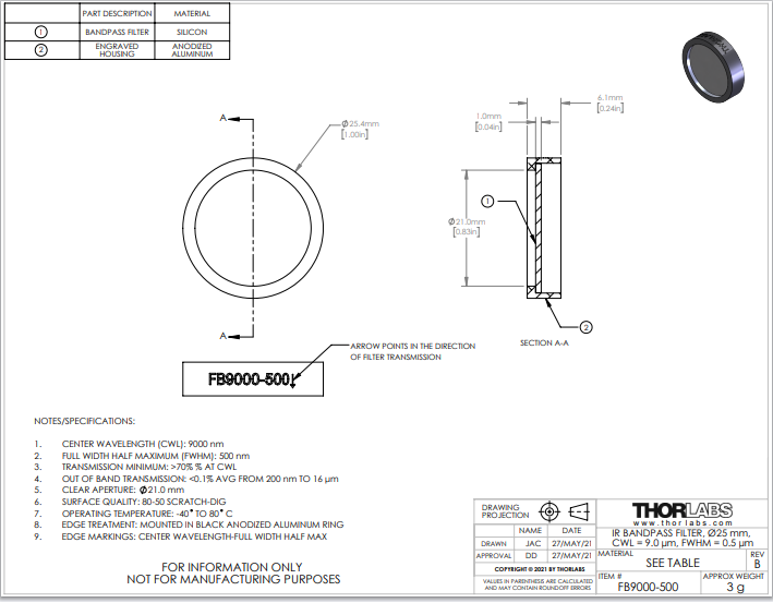 Thorlabs索雷博 FB9000-500 Ø1英寸红外带通滤光片