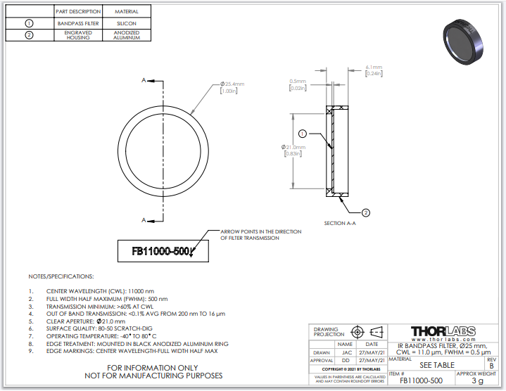 Thorlabs索雷博 FB11000-500 Ø1英寸红外带通滤光片