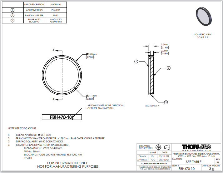 Thorlabs索雷博 FBH470-10 硬膜带通滤光片