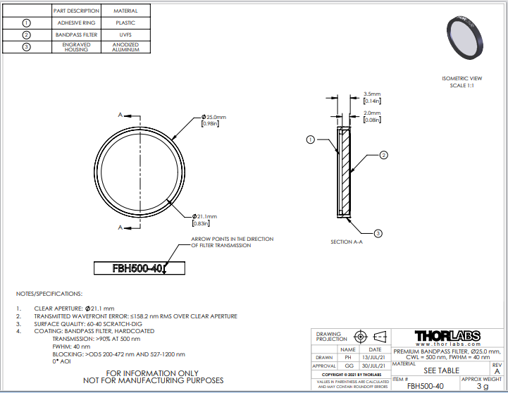 Thorlabs索雷博 FBH500-40 硬膜带通滤光片