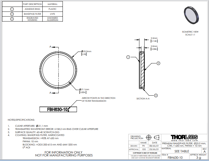 Thorlabs索雷博 FBH630-10 硬膜带通滤光片
