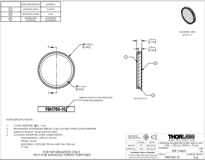 Thorlabs索雷博 FBH750-10 硬膜带通滤光片