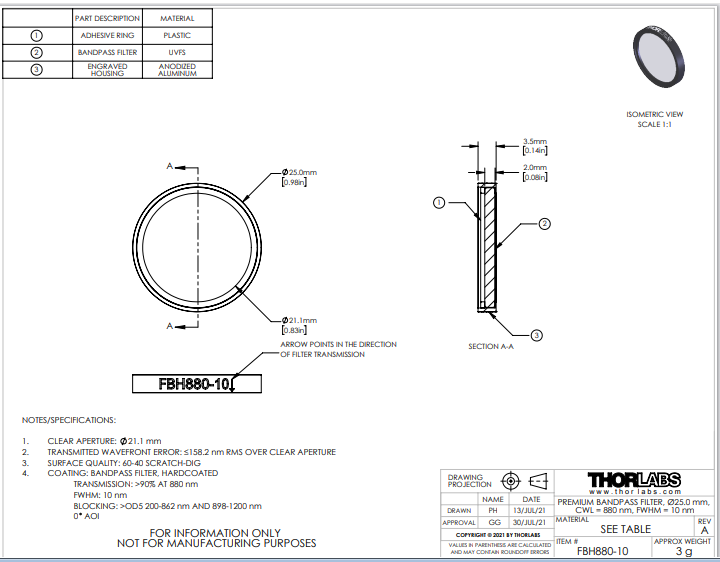 Thorlabs索雷博 FBH880-10 硬膜带通滤光片