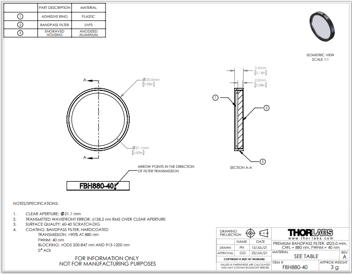 Thorlabs索雷博 FBH880-40 硬膜带通滤光片