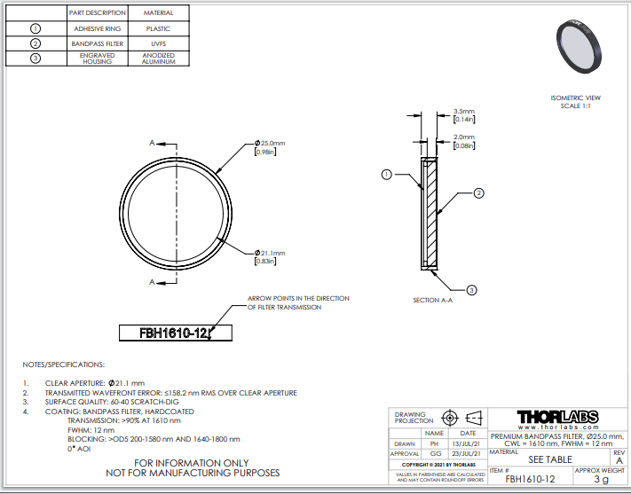 Thorlabs索雷博 FBH1610-12 硬膜带通滤光片