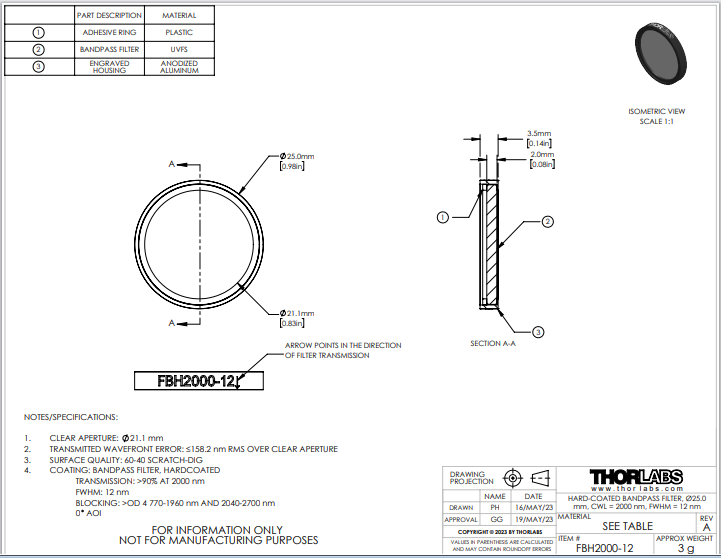 Thorlabs索雷博 FBH2000-12 硬膜带通滤光片