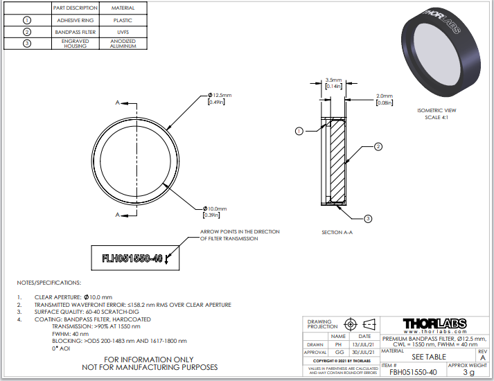 FBH1550-121550 nm(T > 90%)12纳米200 - 1530 nm、1570 - 1700 nm(OD绝对值> 5)