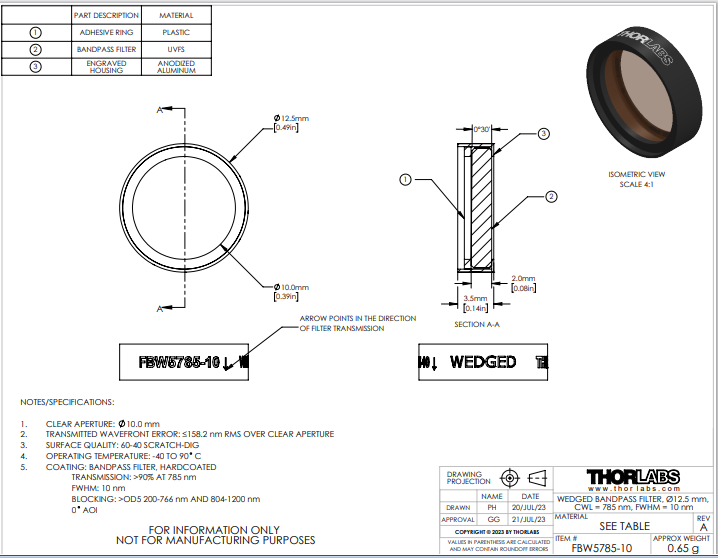 Thorlabs索雷博       FBW5785-10   楔形硬膜带通滤光片