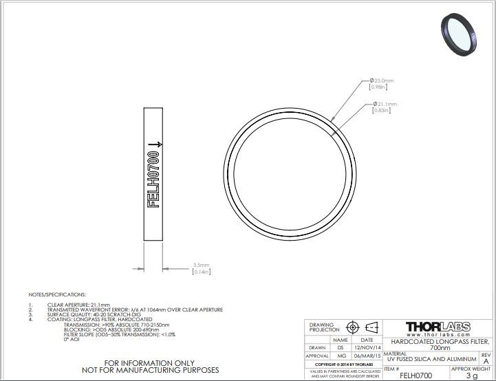 Thorlabs索雷博       FELH0700   Ø25.0 mm长波通滤光片