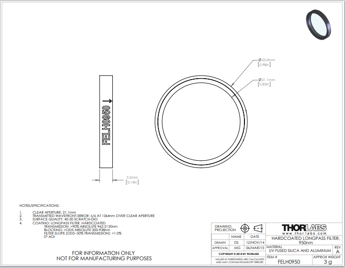 Thorlabs索雷博 FELH0950 Ø25.0 mm长波通滤光片
