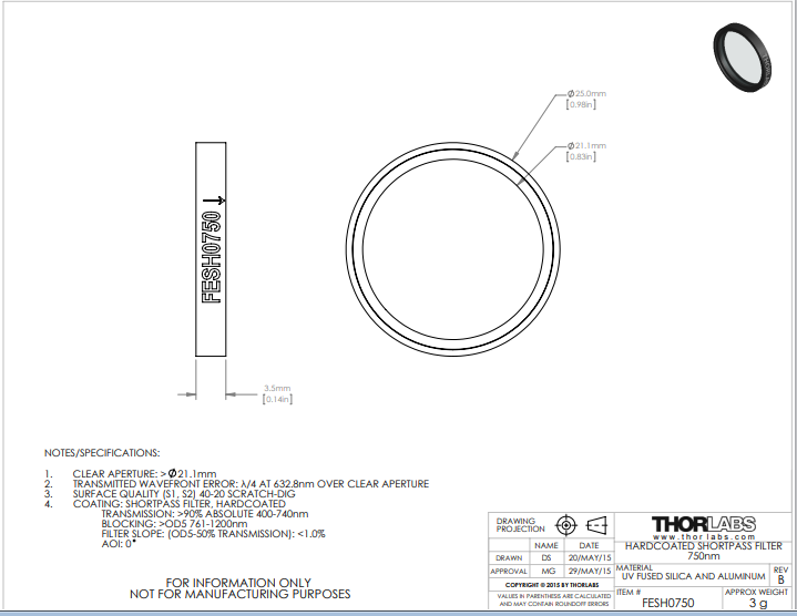 Thorlabs索雷博 FESH0750 Ø25.0 mm短波通滤光片