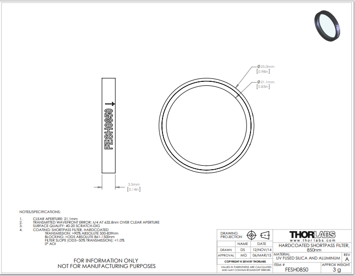 Thorlabs索雷博 FESH0850 Ø25.0 mm短波通滤光片
