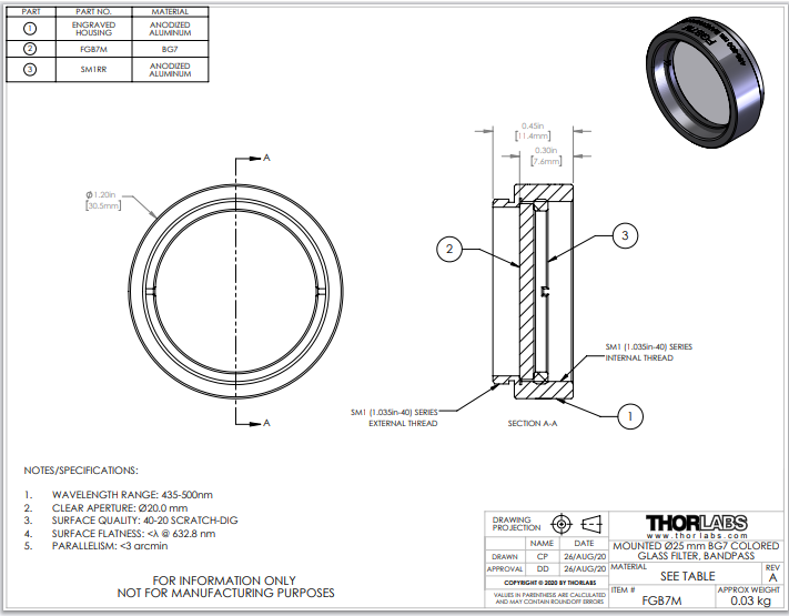 Thorlabs索雷博 FGB7M Ø25 mm BG7彩色玻璃带通滤光片
