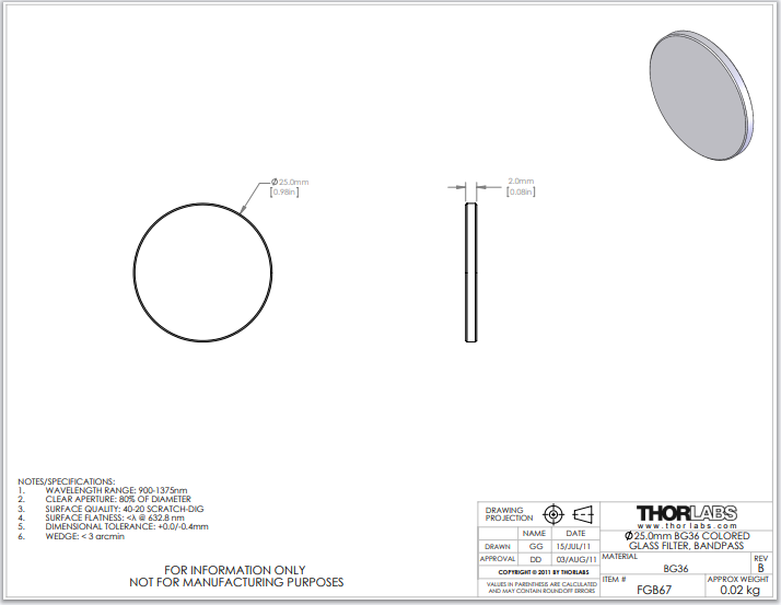 Thorlabs索雷博       FGB67   带通滤光片,BG36有色玻璃
