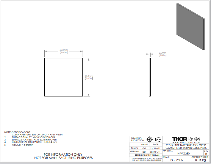 Thorlabs索雷博 FGL280S 长波通有色玻璃滤光片