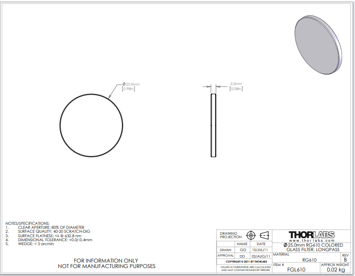 Thorlabs索雷博 FGL610 长波通有色玻璃滤光片