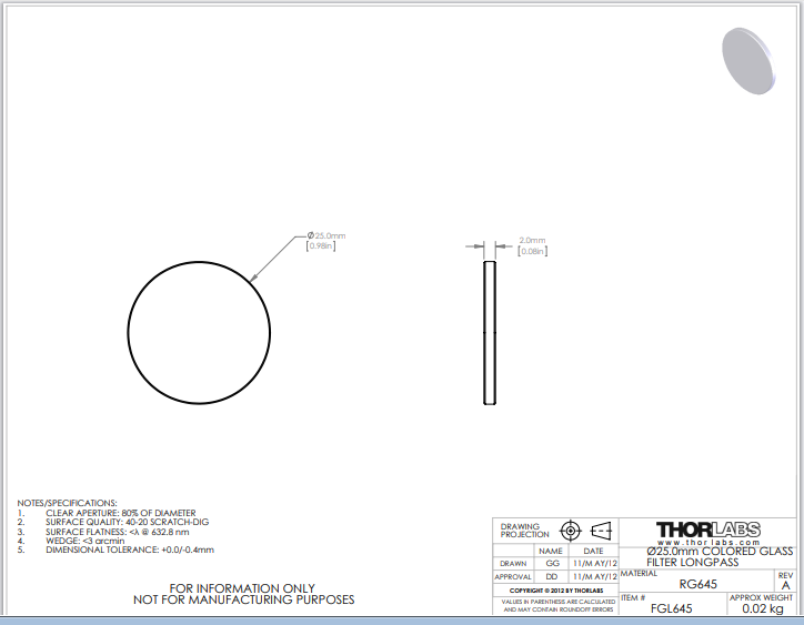 Thorlabs索雷博 FGL645 长波通有色玻璃滤光片