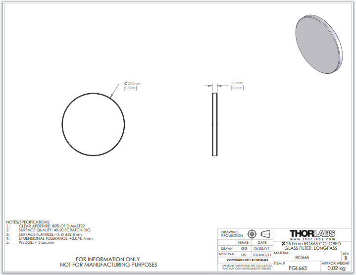 Thorlabs索雷博 FGL665 长波通有色玻璃滤光片