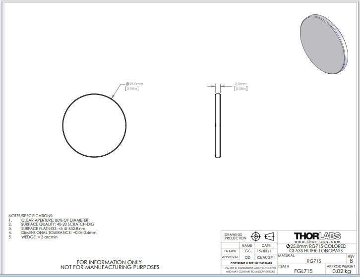 Thorlabs索雷博 FGL715 长波通有色玻璃滤光片