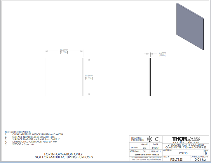 Thorlabs索雷博 FGL715S 长波通有色玻璃滤光片