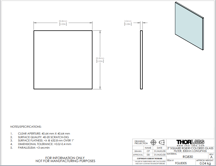 Thorlabs索雷博 FGL830S 长波通有色玻璃滤光片