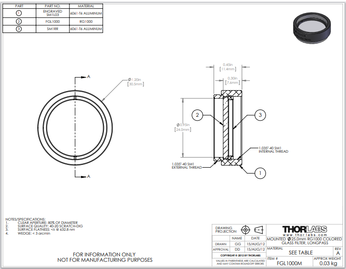 Thorlabs索雷博 FGL1000M 长波通彩色玻璃滤光片
