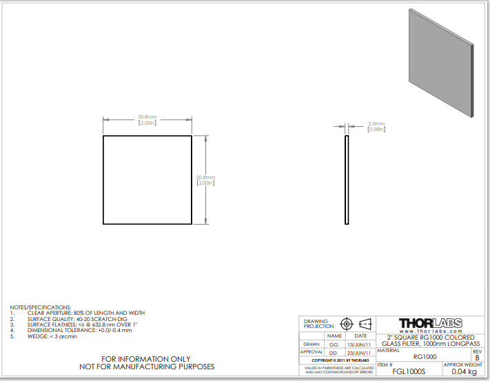 Thorlabs索雷博 FGL1000S 长波通有色玻璃滤光片