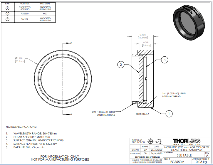 Thorlabs索雷博       FGS550M   Ø25 mm KG2彩色玻璃带通滤光片