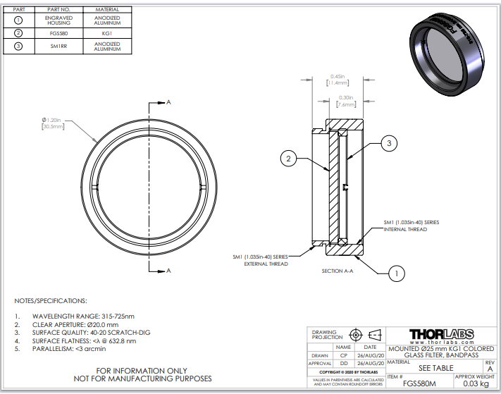 Thorlabs索雷博 FGS580M Ø25 mm KG1彩色玻璃带通滤光片