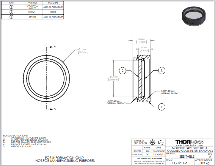 Thorlabs索雷博 FGUV11M Ø25 mm UG11彩色玻璃带通滤光片