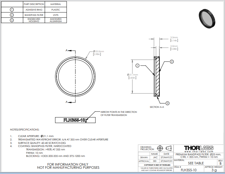 Thorlabs索雷博 FLH355-10 硬膜带通滤光片