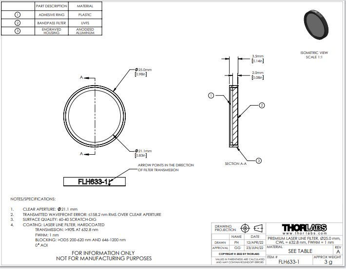 FLH05633-3632.8 纳米(T > 90%)3纳米200 - 619 nm、647 - 1200 nm(OD绝对值 > 5)