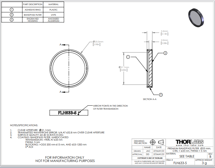 Thorlabs索雷博 FLH633-5 硬膜带通滤光片