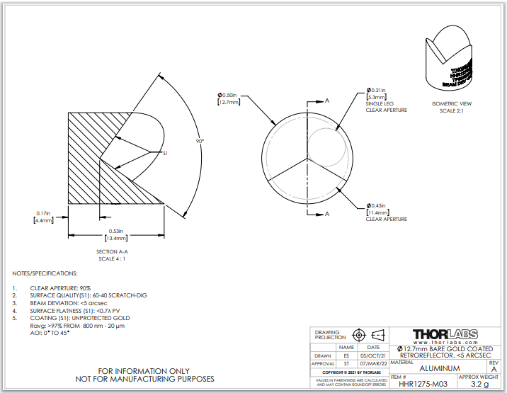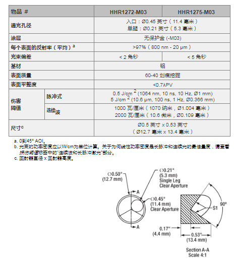 Thorlabs索雷博       HHR1275-M03   复型工艺的铝质中空回射器