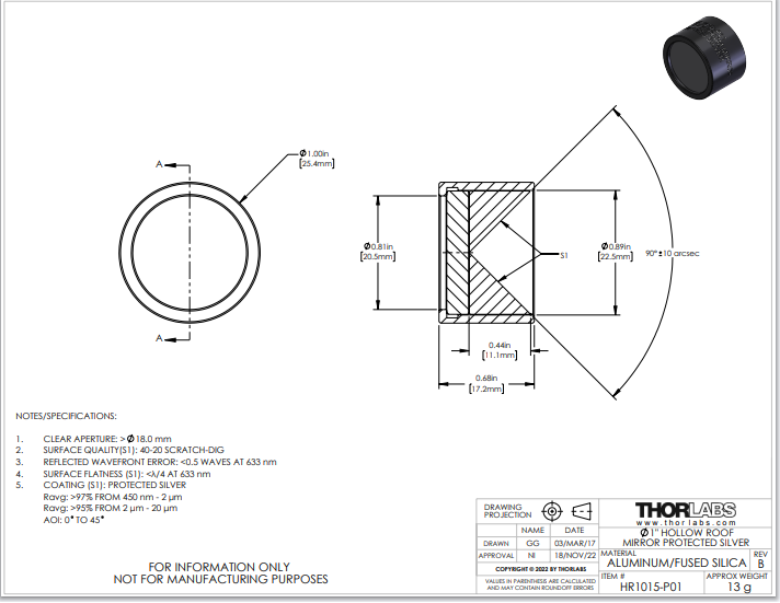 Thorlabs索雷博 HR1015-P01 中空屋脊棱镜反射镜