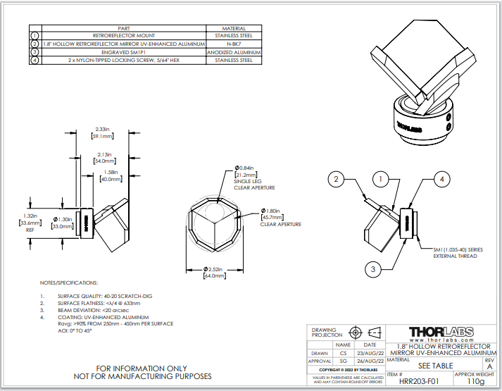 Thorlabs索雷博       HRR203-F01   中空回射器