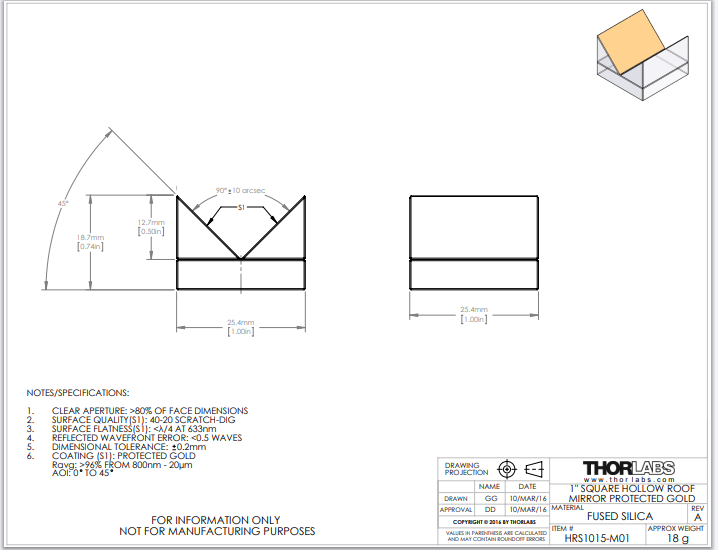 Thorlabs索雷博 HRS1015-M01 中空屋脊棱镜反射镜