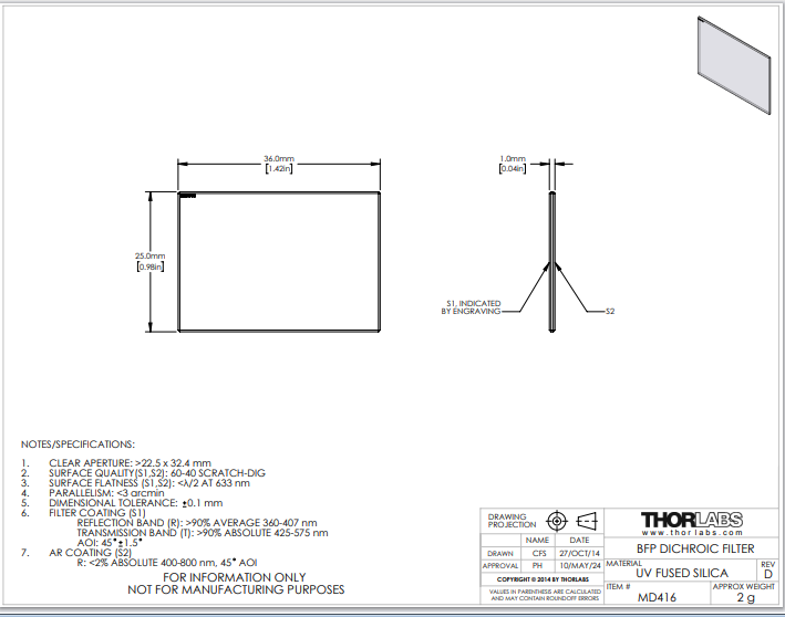 Thorlabs索雷博 MD416 BFP二向色性滤光片