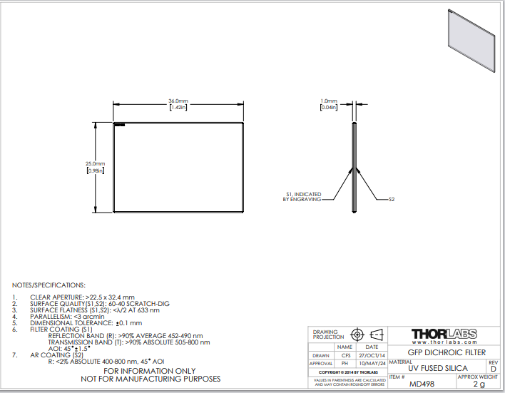 Thorlabs索雷博 MD498 GFP二向色性滤光片