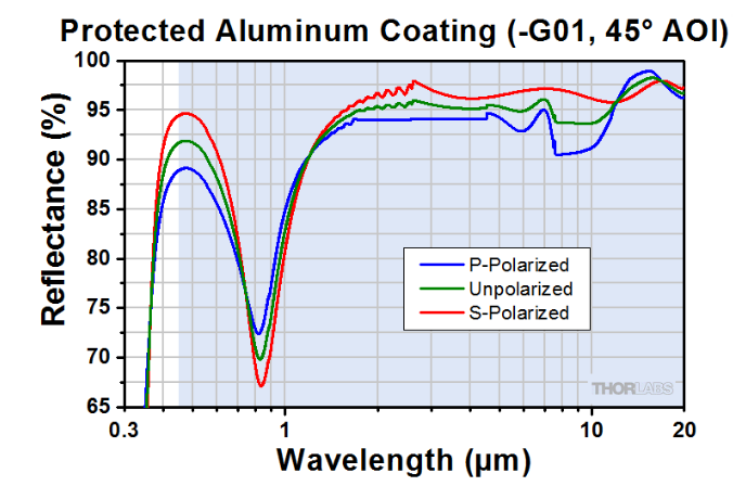 反射率从 450 nm 到 2 µm,R平均值> 90%从 2 到 20 µm,