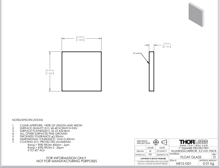 Thorlabs索雷博       ME1S-G01   方形平面反射镜